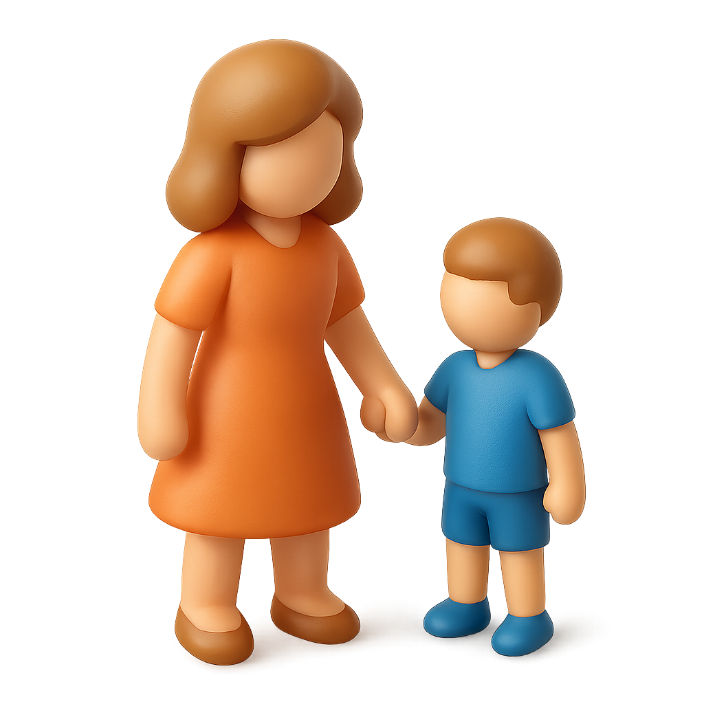 A stylized 3D icon depicting a woman in an orange dress holding the hand of a child dressed in blue. The figures have a smooth, volumetric appearance against a softly glowing background.