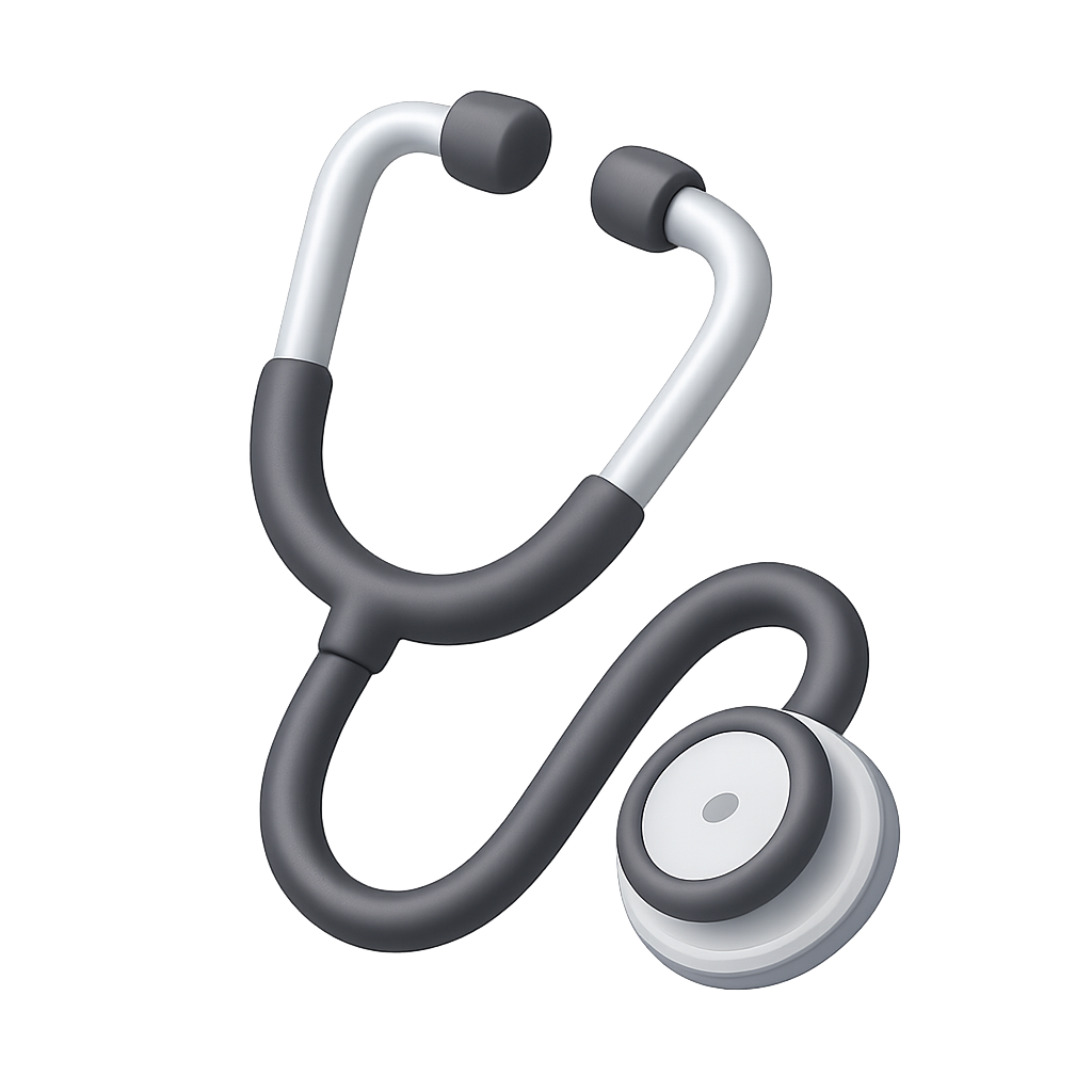 A sleek, 3D representation of a stethoscope with a transparent background, showcasing a three-quarter view. The design features a modern aesthetic with a volumetric feel.