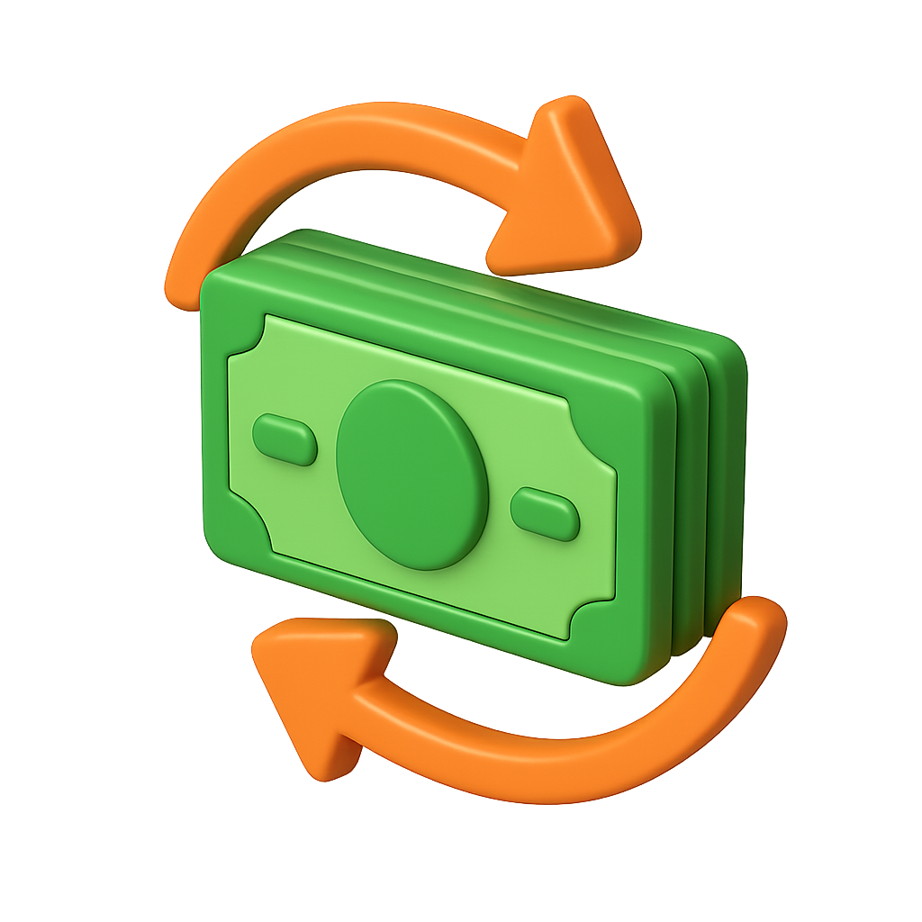 A vibrant 3D icon depicting a stack of money with arrows indicating movement, set against a soft gradient background. The design features a green cash stack and orange arrows, creating a sense of flow.