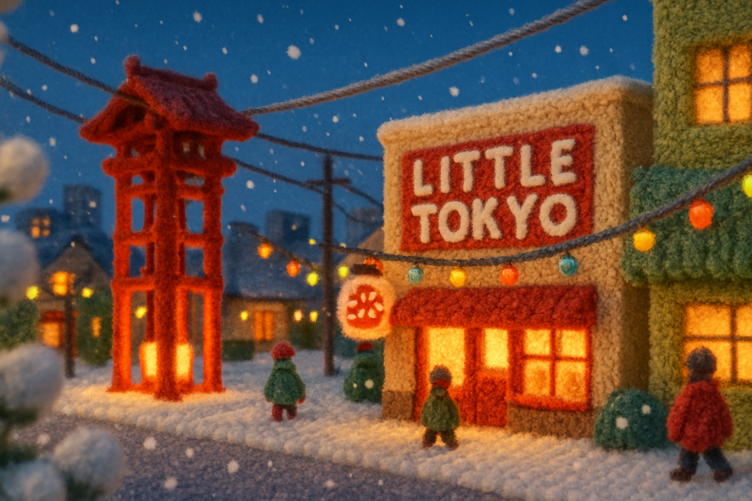 A charming winter scene set in Little Tokyo, Los Angeles, featuring woolen structures, snowflakes, and tiny figures amidst soft lighting and festive decorations.