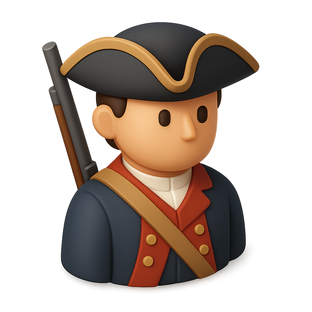 /Collection: /by davooda/Type: PNG/A stylized 3D icon depicting a continental American soldier in a historical uniform, featuring a tricorn hat and a musket, designed with a transparent background and volumetric feel.