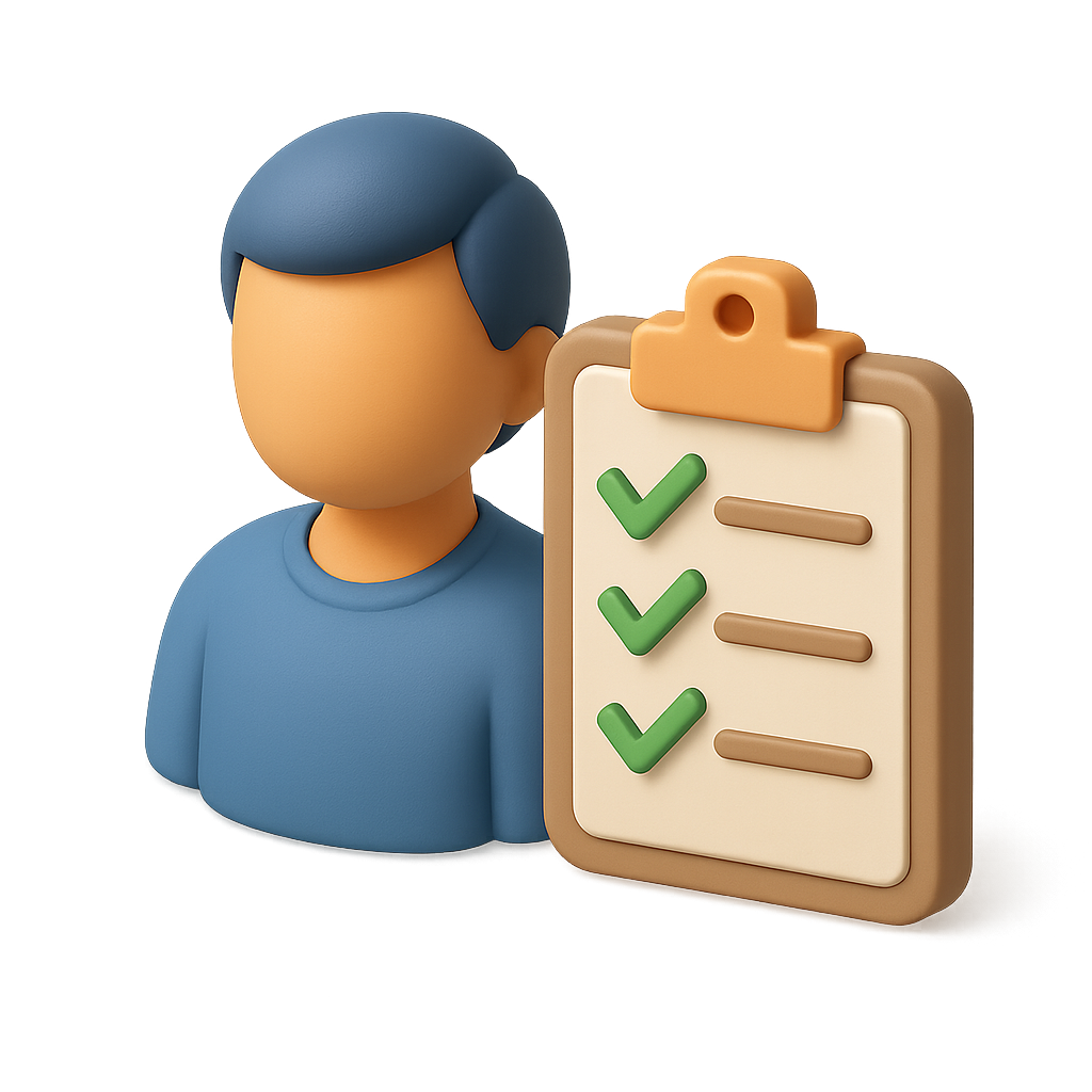 A colorful 3D icon featuring a person and a checklist. The person is depicted in a simple, stylized manner, standing beside a clipboard with checkmarks, creating a modern, isometric design.
