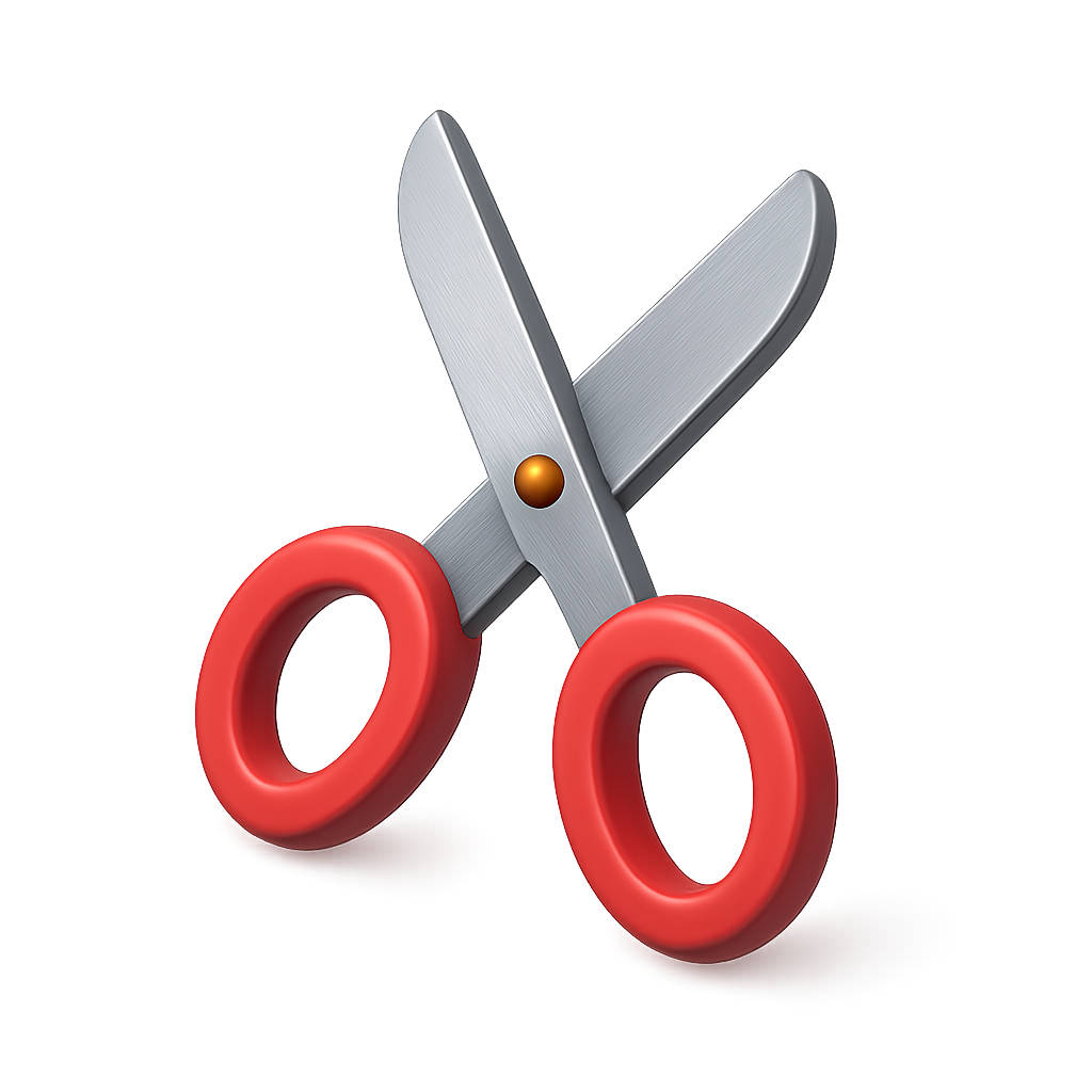 A three-dimensional scissors icon featuring metallic blades and vibrant red handles, presented in a three-quarter view with a sleek, isometric design.