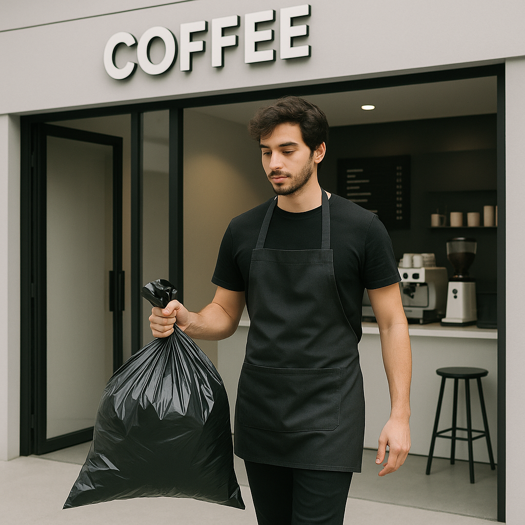 Barista Taking Out the Trash in Modern Minimalist Setting