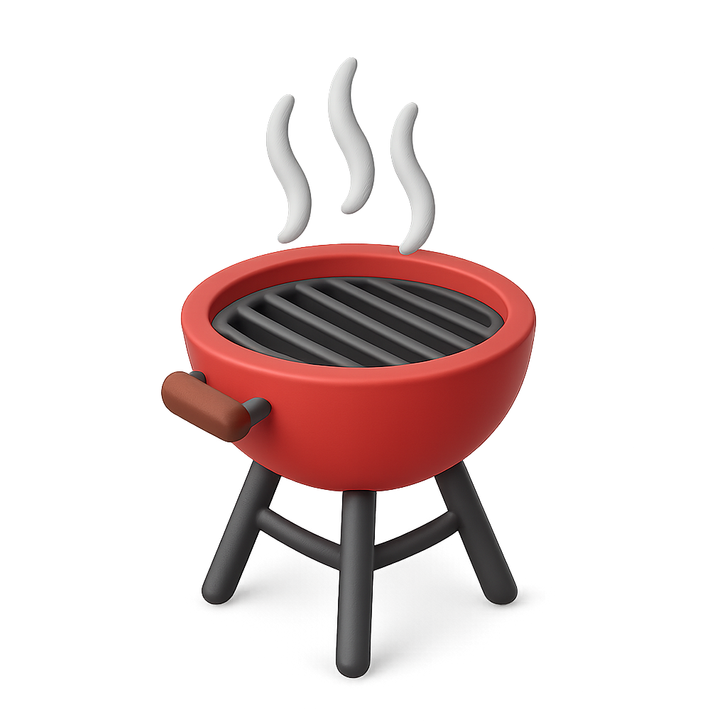 A vibrant 3D icon of a grill featuring a red body, black grill grates, and steam rising from the top. The design is in a three-quarter view with a clean, isometric style.