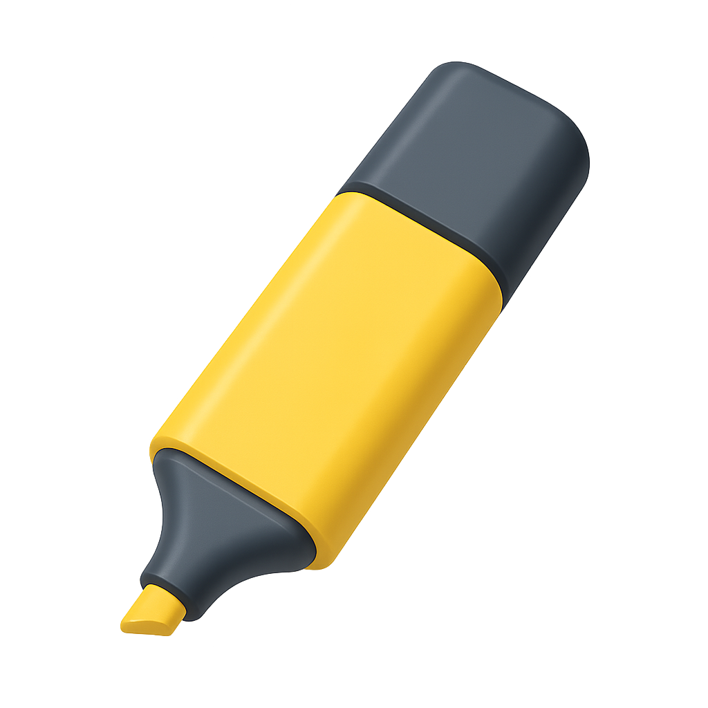 /Collection: /by davooda/Type: PNG/This image features a 3D rendered highlighter with a cap, shown in a three-quarter isometric view. The highlighter is primarily yellow with a dark gray cap, showcasing a volumetric design against a transparent background.