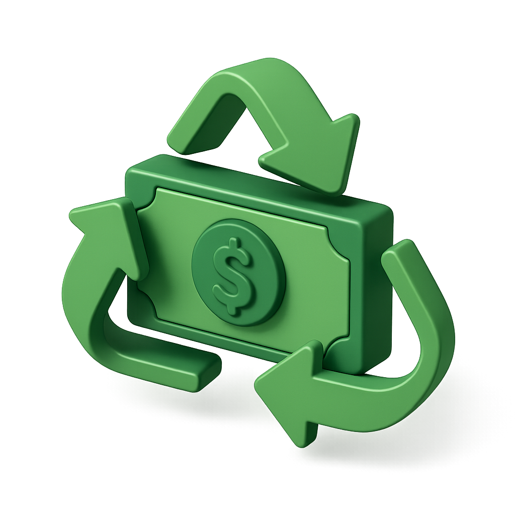 /Collection: /by davooda/Type: PNG/A three-dimensional icon representing the recycling of money, featuring a dollar bill surrounded by green arrows. The design is isometric and volumetric with a transparent background.