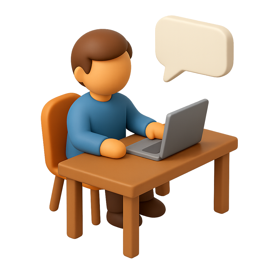 /Collection: /by davooda/Type: PNG/A colorful 3D icon depicting a person seated at a desk using a laptop. A speech bubble hovers above, enhancing the conversational theme, all in a three-quarter view.