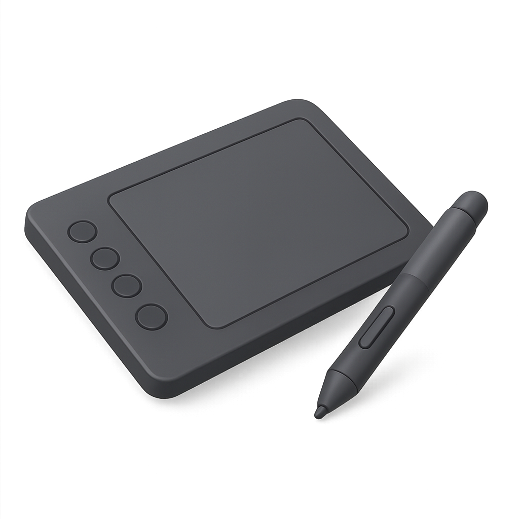 A sleek 3D illustration of a drawing tablet alongside a stylus, presented in a three-quarter isometric view. The design features a transparent background, emphasizing its modern aesthetic.