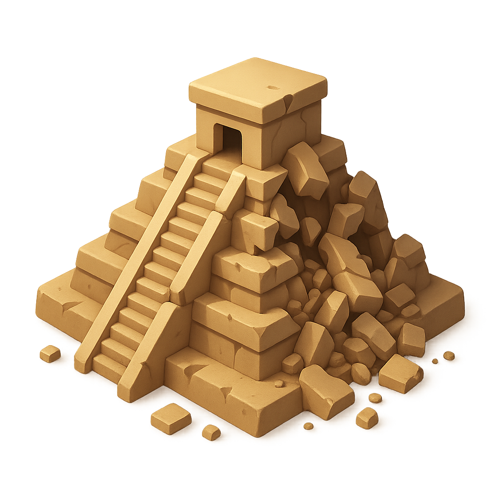 /Collection: /by davooda/Type: PNG/A stylized 3D representation of a Mayan temple in a collapsed state, featuring stairs and surrounding rubble. The icon showcases a warm color palette and an isometric perspective.