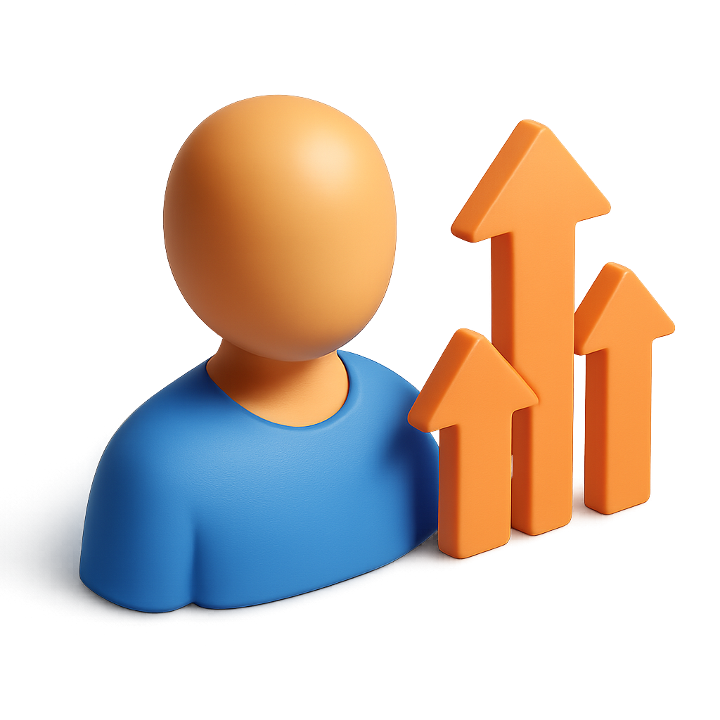 /Collection: /by davooda/Type: PNG/A stylized 3D icon featuring a simplistic human figure with a blue torso and an orange head, accompanied by three upward arrows. The design has a transparent background and a three-quarter isometric view.