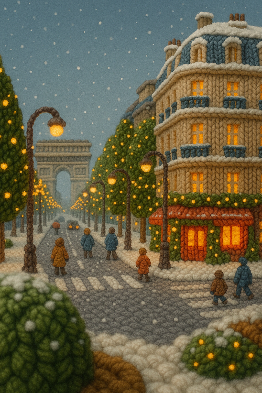 /Collection: /by davooda/Type: PNG/A whimsical 3D depiction of the Champs-Élysées in Paris during winter, featuring textured buildings and trees made of yarn-like materials, with snow gently falling and festive lights illuminating the scene.