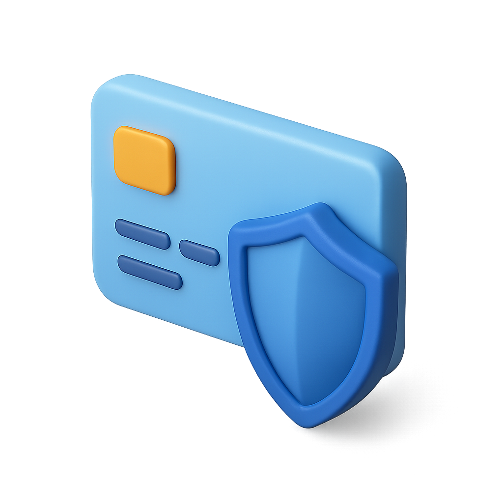 This image features a 3D icon of a credit card with a shield, designed in a sleek, isometric style. The card showcases a blue color scheme, enhancing its modern appeal.