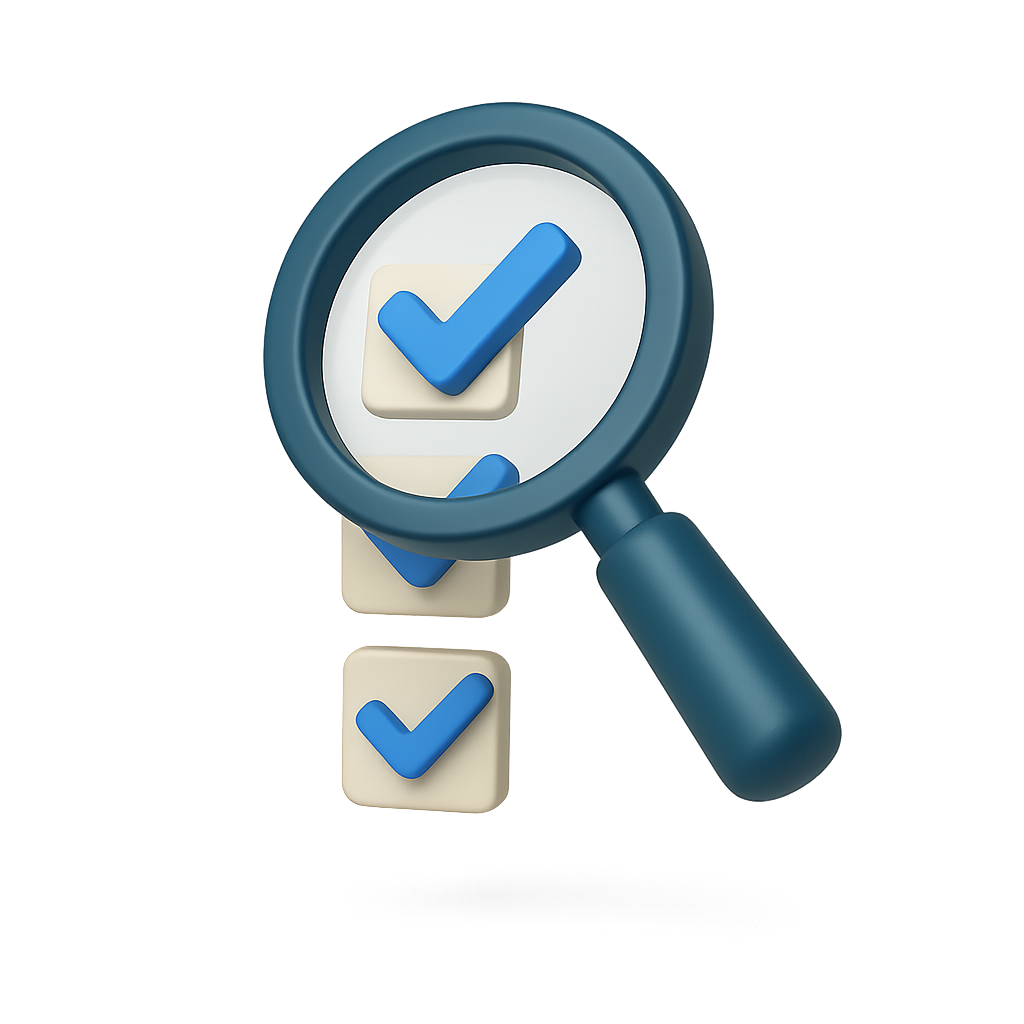 A 3D isometric icon featuring a magnifying glass over checkboxes, showcasing a modern design with a transparent background and a three-quarter view.