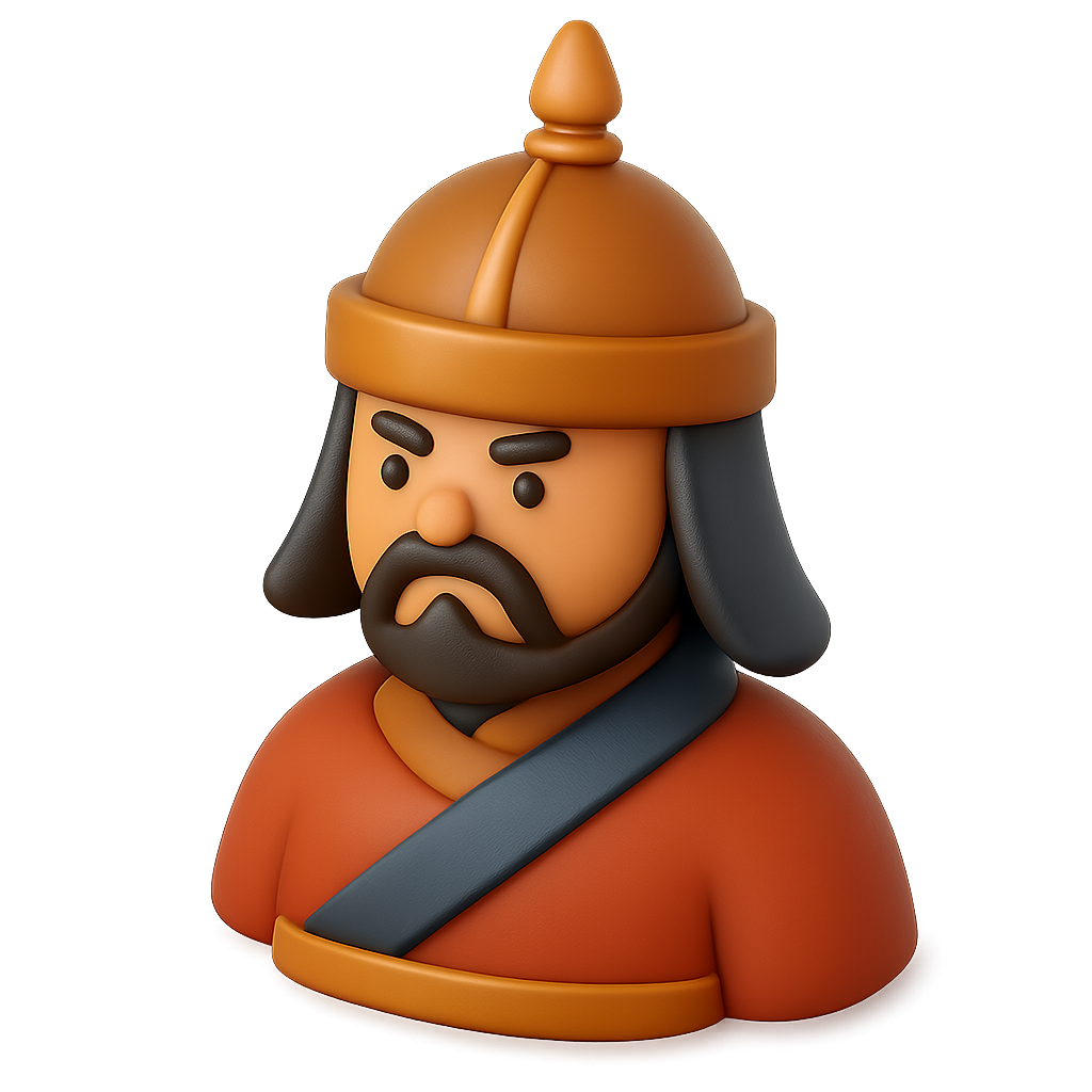 /Collection: /by davooda/Type: PNG/A stylized isometric 3D icon depicting a Mongol ruler. The character features a traditional hat and a stern expression, rendered with a volumetric feel against a transparent background.