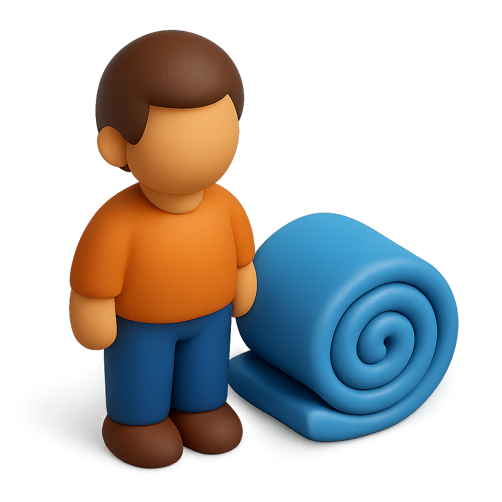 A 3D icon depicting a stylized person standing beside a rolled-up blanket. The figure has a simplistic design with an orange shirt and blue pants, while the blanket is a soft blue.