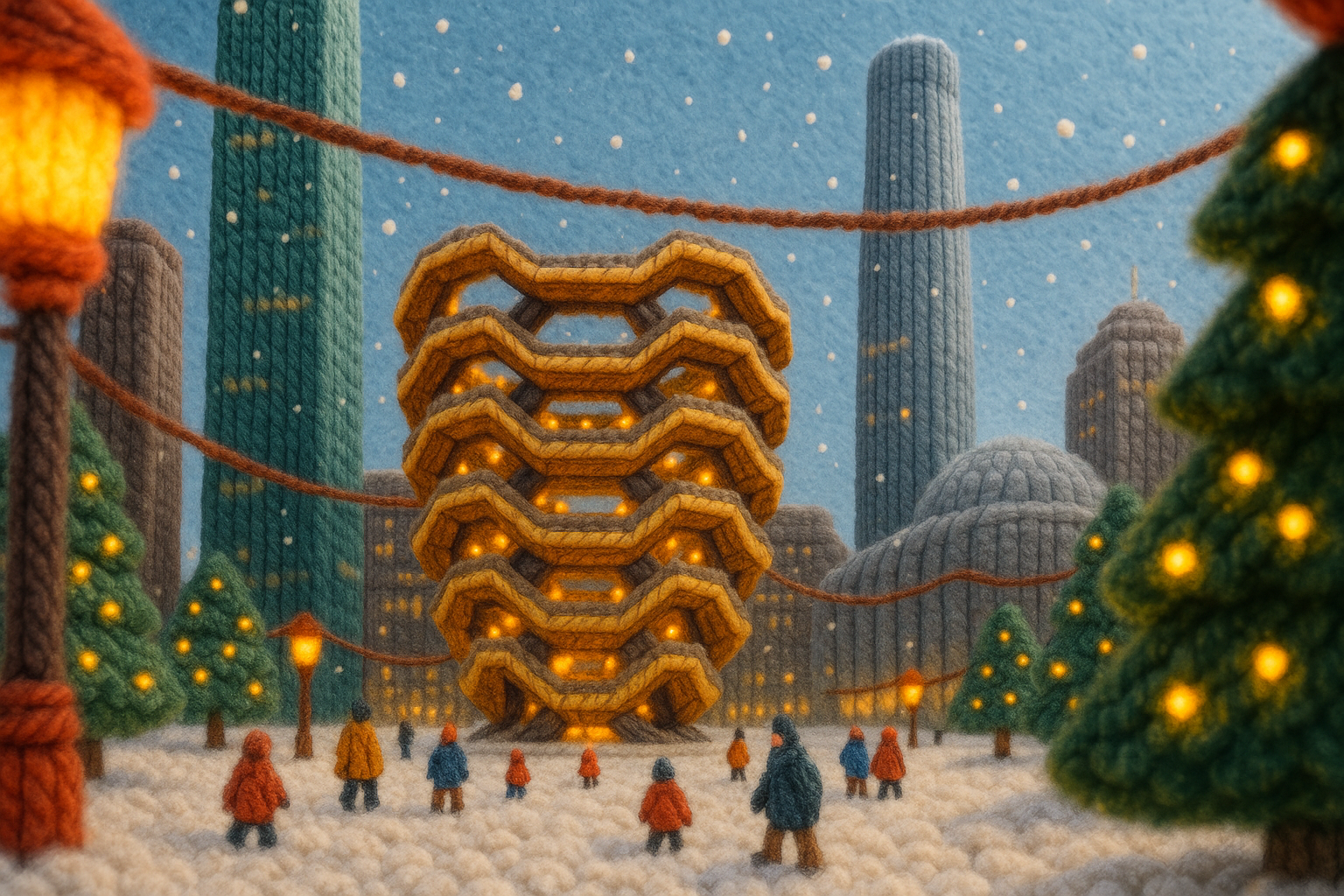 /Collection: /by davooda/Type: PNG/A whimsical winter scene at Hudson Yards, featuring soft, yarn-like structures surrounded by tiny figures, snow gently falling, and warm holiday lights creating a festive atmosphere.