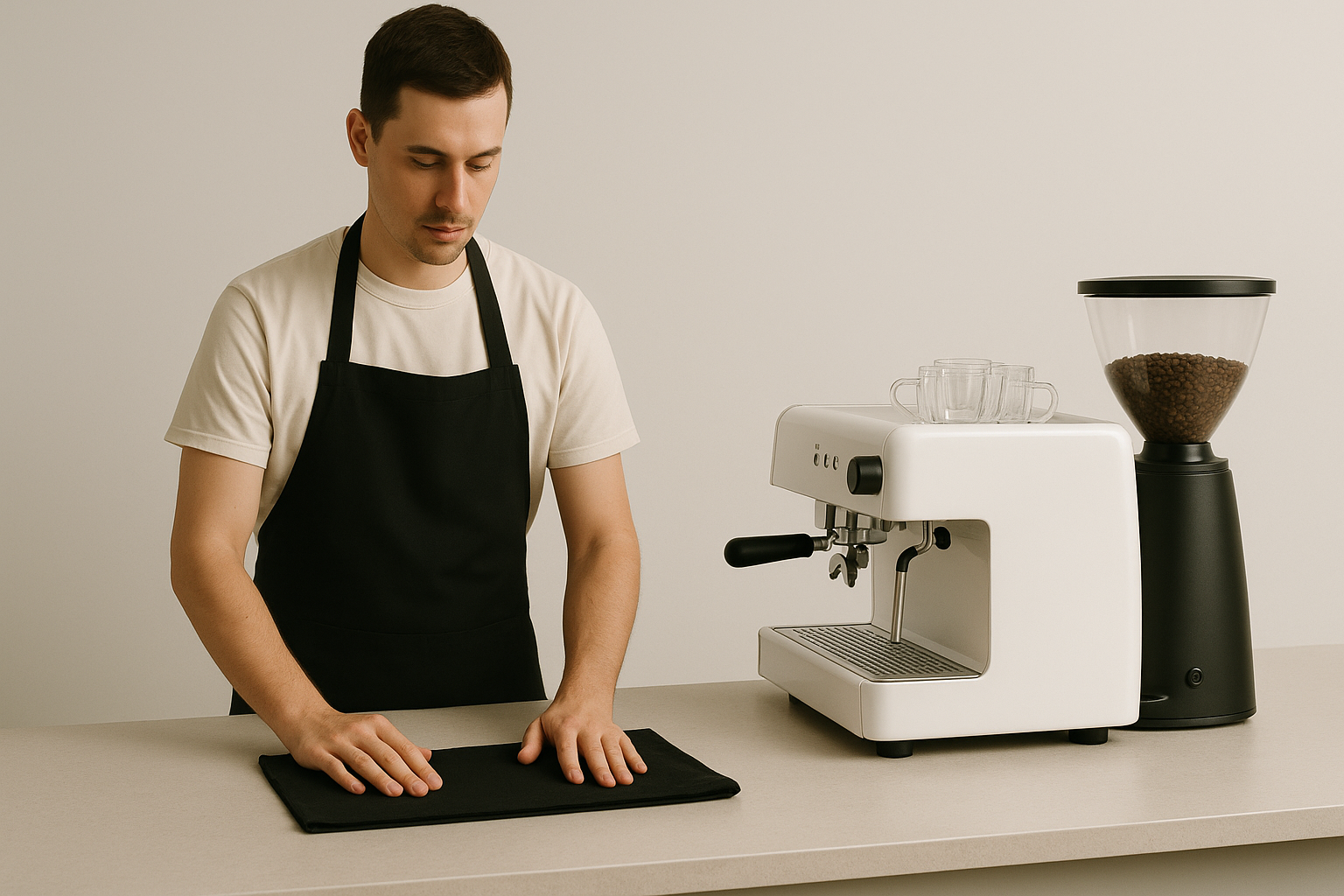/Collection: /by davooda/Type: PNG/A modern barista in a minimalist setting prepares his workspace, showcasing a stylish coffee machine and coffee beans nearby. The atmosphere is clean and contemporary.