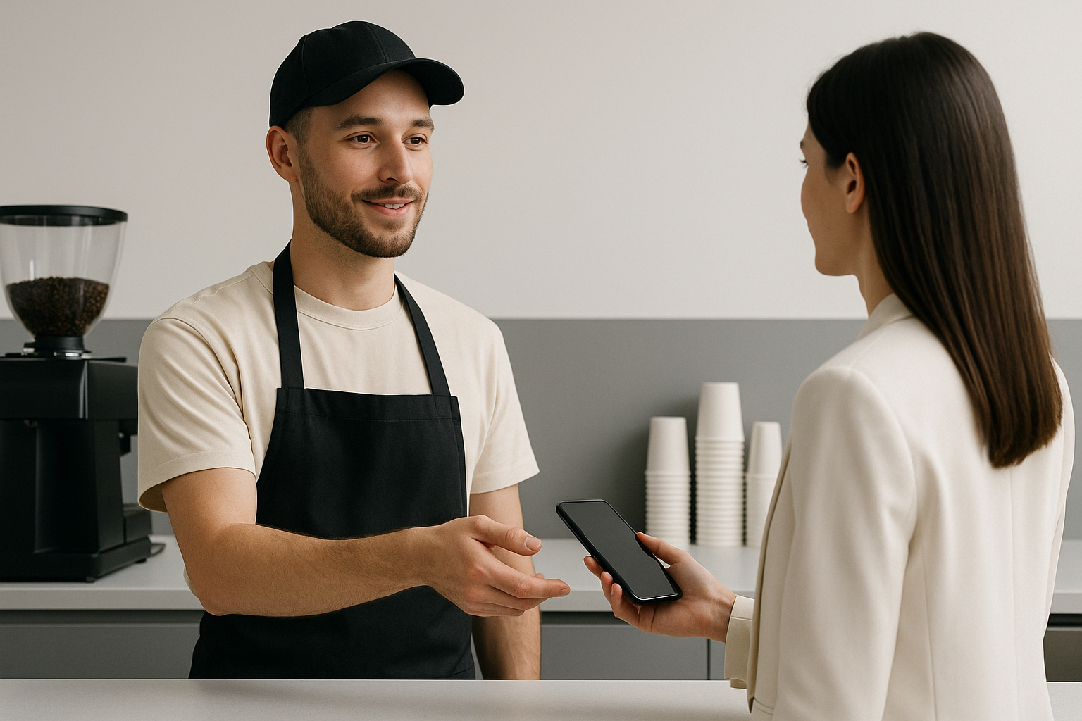 Smiling Barista Engaging with Customer in Modern CafΓ©