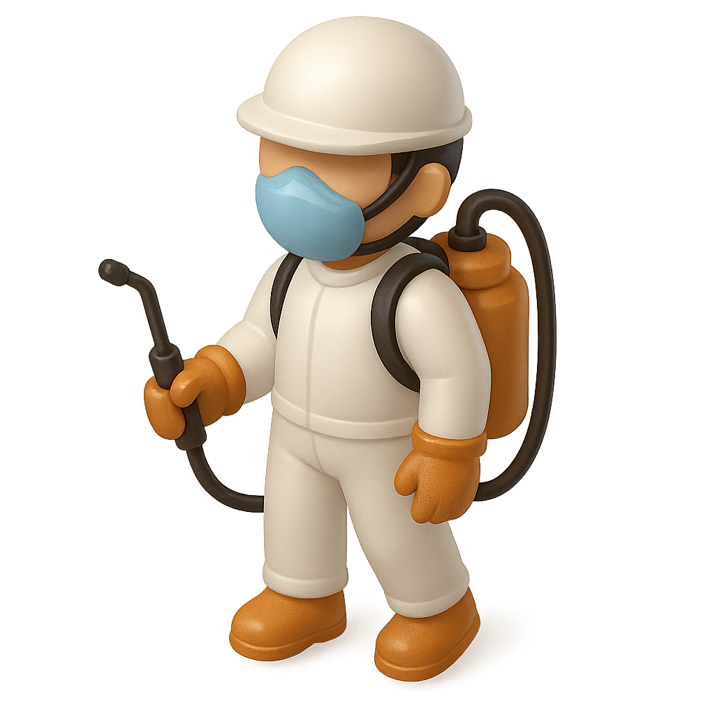 A 3D icon of a pest control technician wearing a protective mask and suit, holding a sprayer. The character is designed in a volumetric, isometric style with a transparent background.