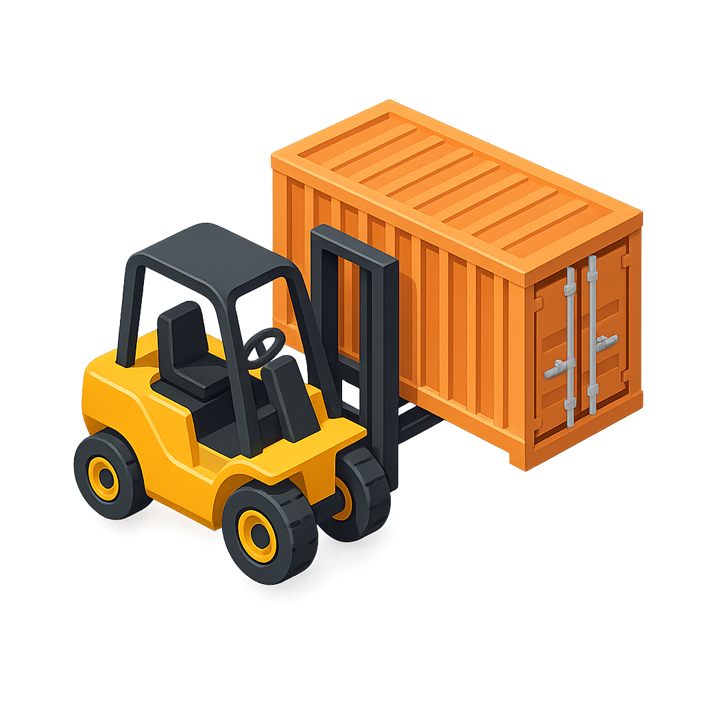 A 3D isometric icon depicting a forklift moving a shipping container. The forklift is in yellow and black, while the container is orange with metallic details.