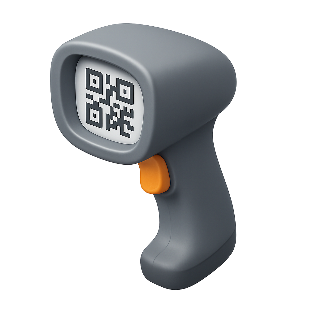 /Collection: /by davooda/Type: PNG/A 3D icon of a QR code scanner gun, designed in a three-quarter view with volumetric and isometric effects. The scanner features a gray body and an orange trigger, set against a neutral backdrop.
