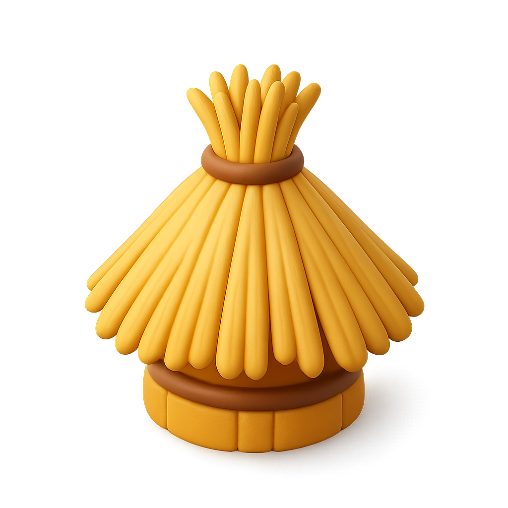 /Collection: /by davooda/Type: PNG/A stylized 3D representation of a thatcher roof made from straw, featuring a rounded base and a textured straw design in a three-quarter view. The vibrant yellow color and smooth shapes give it a volumetric feel.