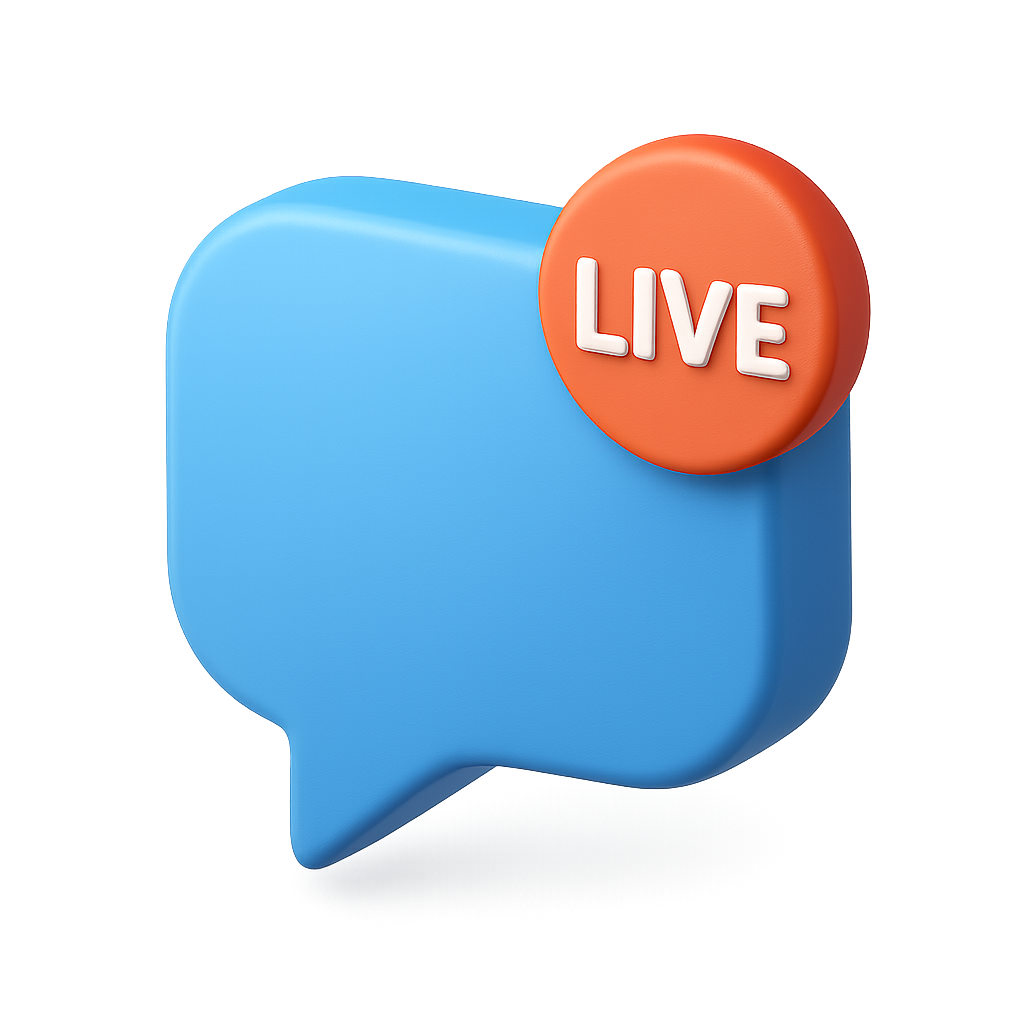 A visually appealing 3D icon of a chat bubble in blue, featuring an orange circular 'LIVE' notification. The design has a transparent background and showcases a three-quarter view with a volumetric, isometric feel.