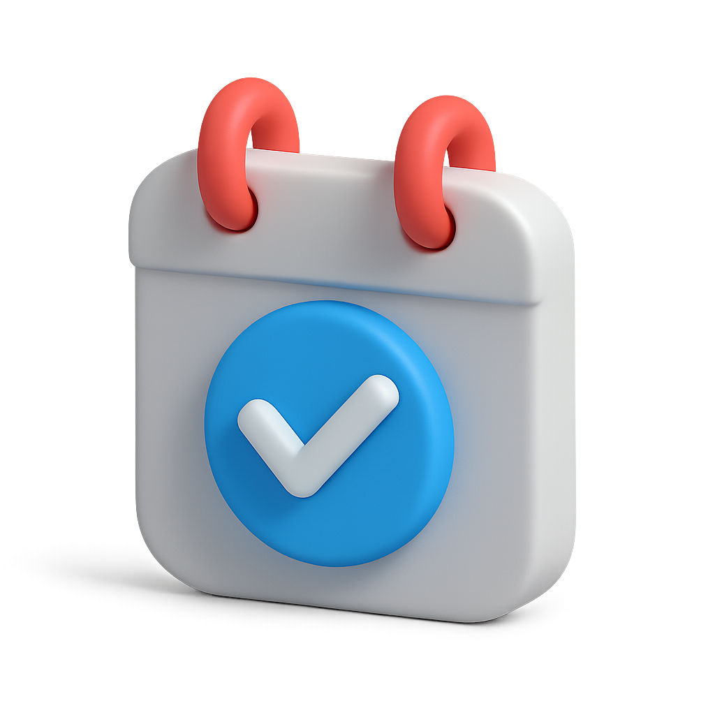 A stylized 3D calendar icon featuring a prominent blue checkmark. The design is in a three-quarter view with a clean, transparent background, showcasing a modern isometric look.