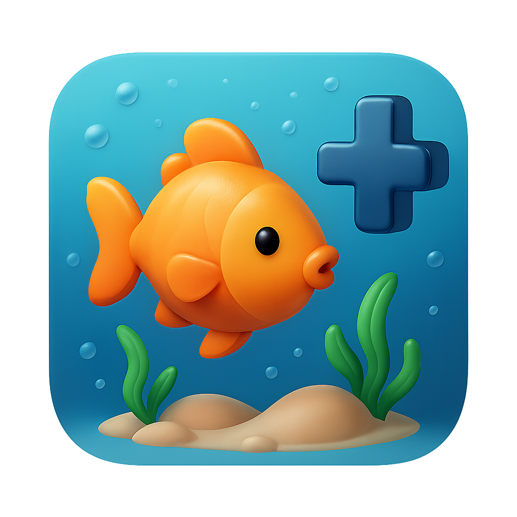 A vibrant 3D icon of a fish swimming in an underwater scene, featuring bubbles, seaweed, and a playful design, perfect for app or game use.