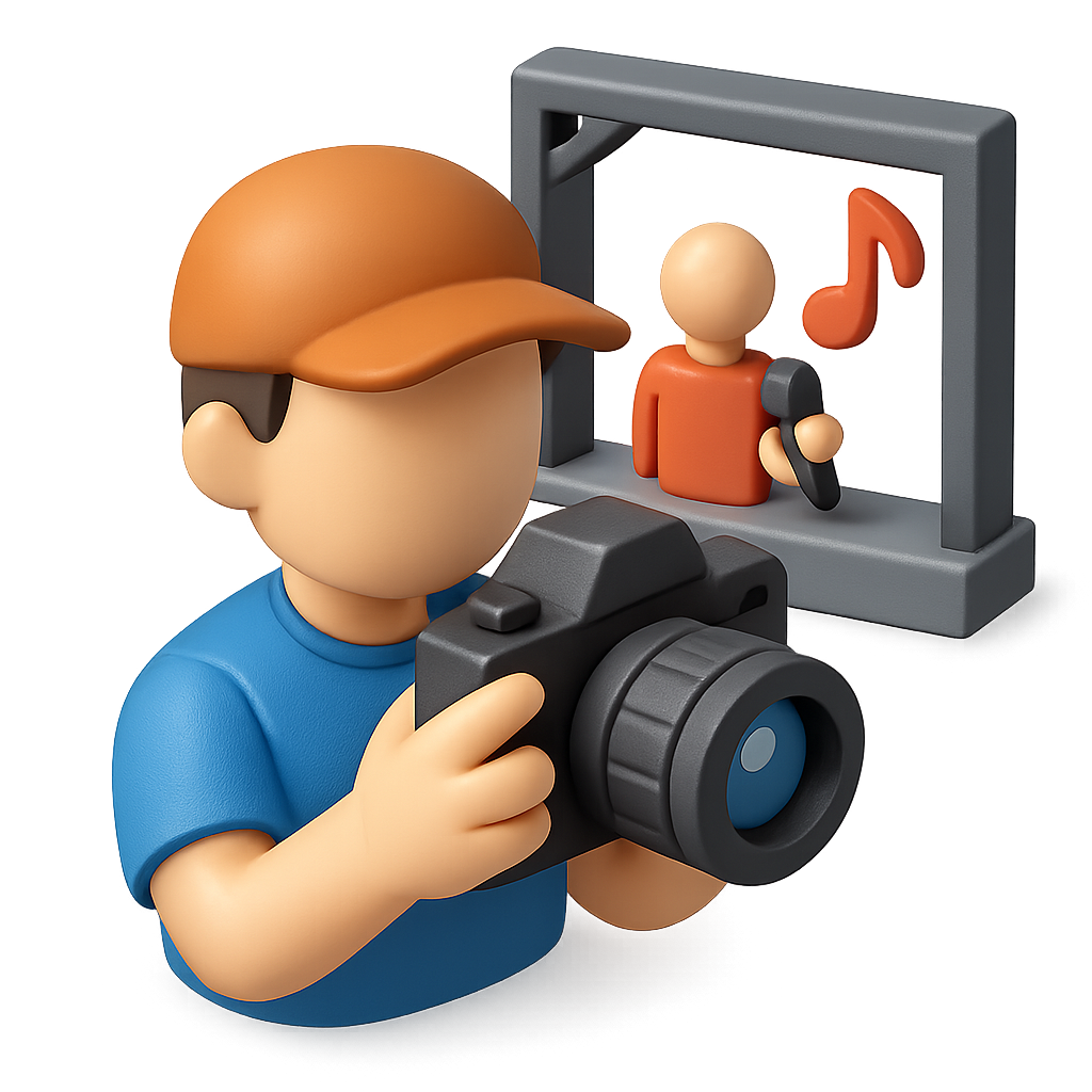 /Collection: /by davooda/Type: PNG/A stylized 3D icon depicting a concert photographer holding a camera, with a concert scene in the background. The design features vibrant colors and an isometric perspective.