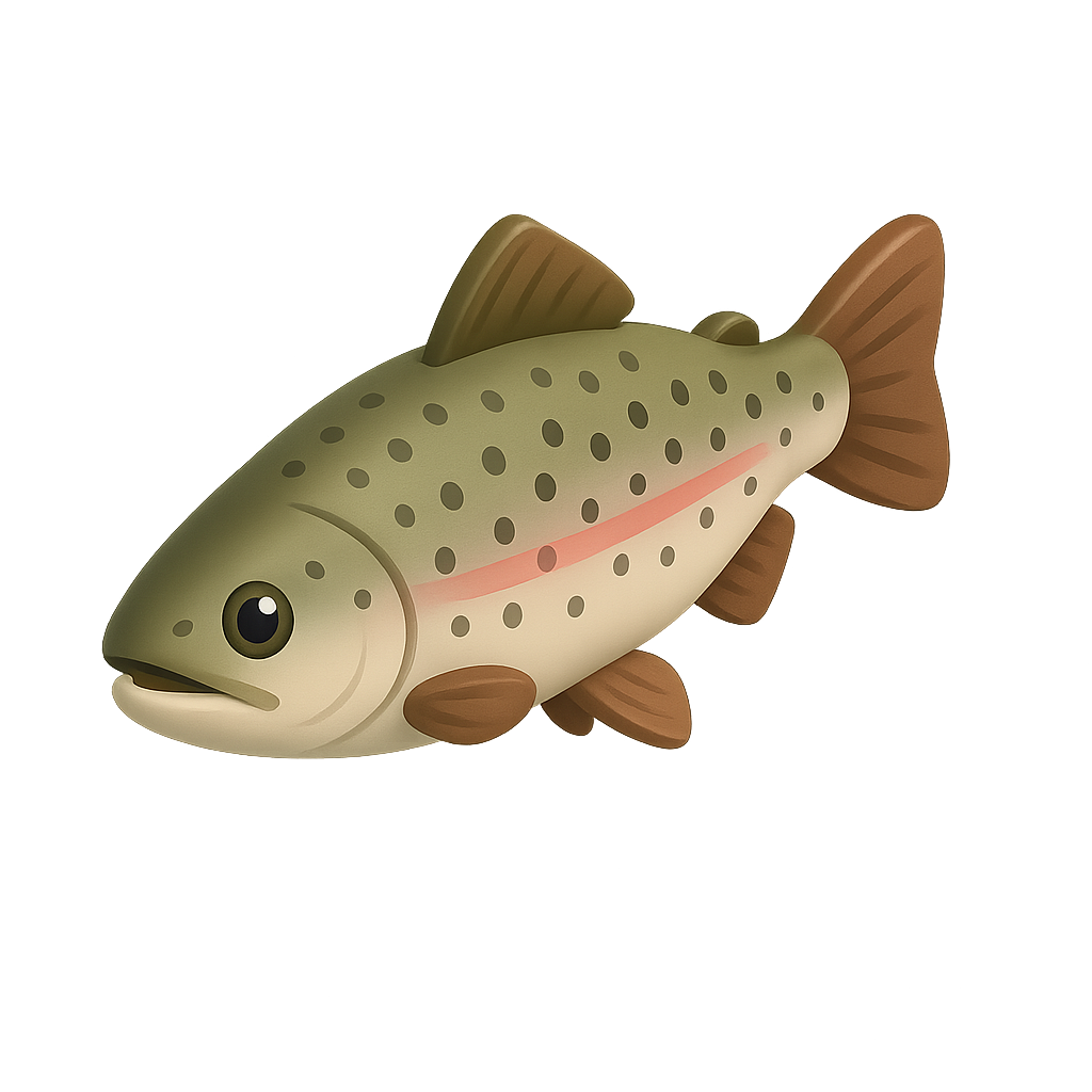 A stylized 3D icon of a trout fish depicted in a three-quarter view. The trout features a smooth surface with spots and a volumetric shape, set against a subtle blurred background.