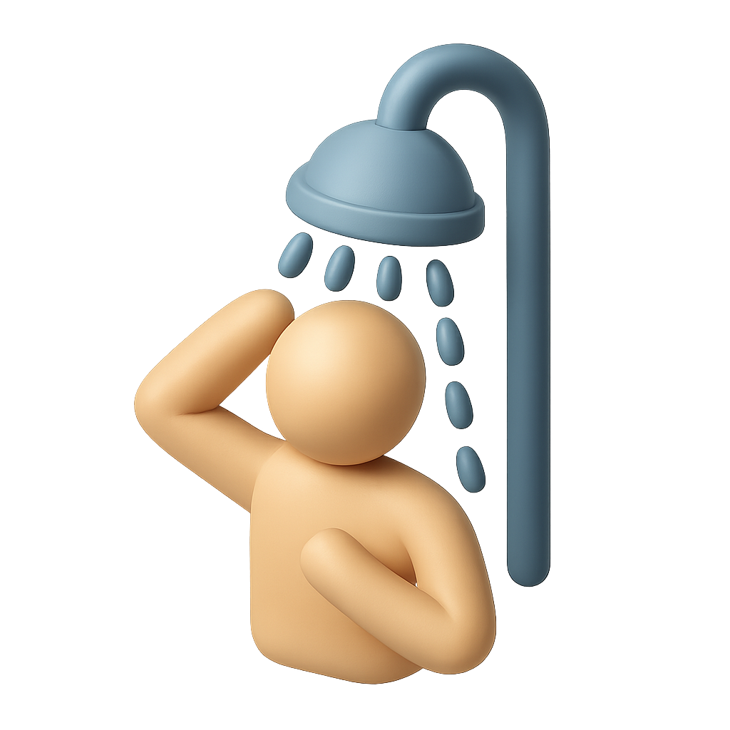 A minimalist 3D icon depicting a person showering, featuring a showerhead with water droplets. The design has a transparent background and is presented in an isometric, volumetric style.