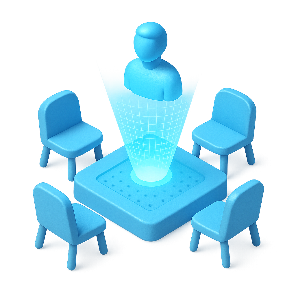 A visually striking 3D icon depicting a hologram meeting room with a floating figure and blue chairs surrounding a central holographic display. The isometric design adds depth.