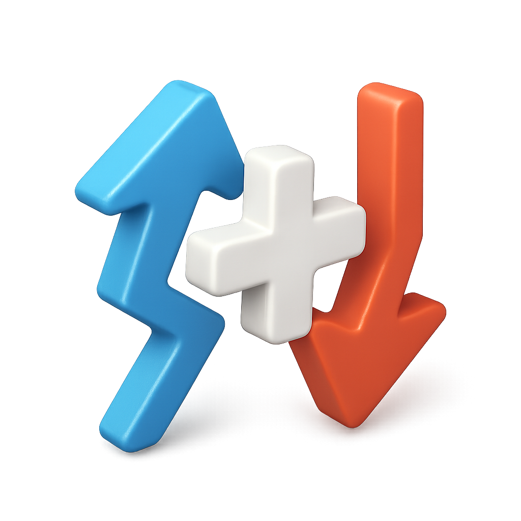 This image features two zigzag arrows, one blue and one orange, positioned alongside a white plus symbol. The design has a 3D isometric feel with a transparent background.