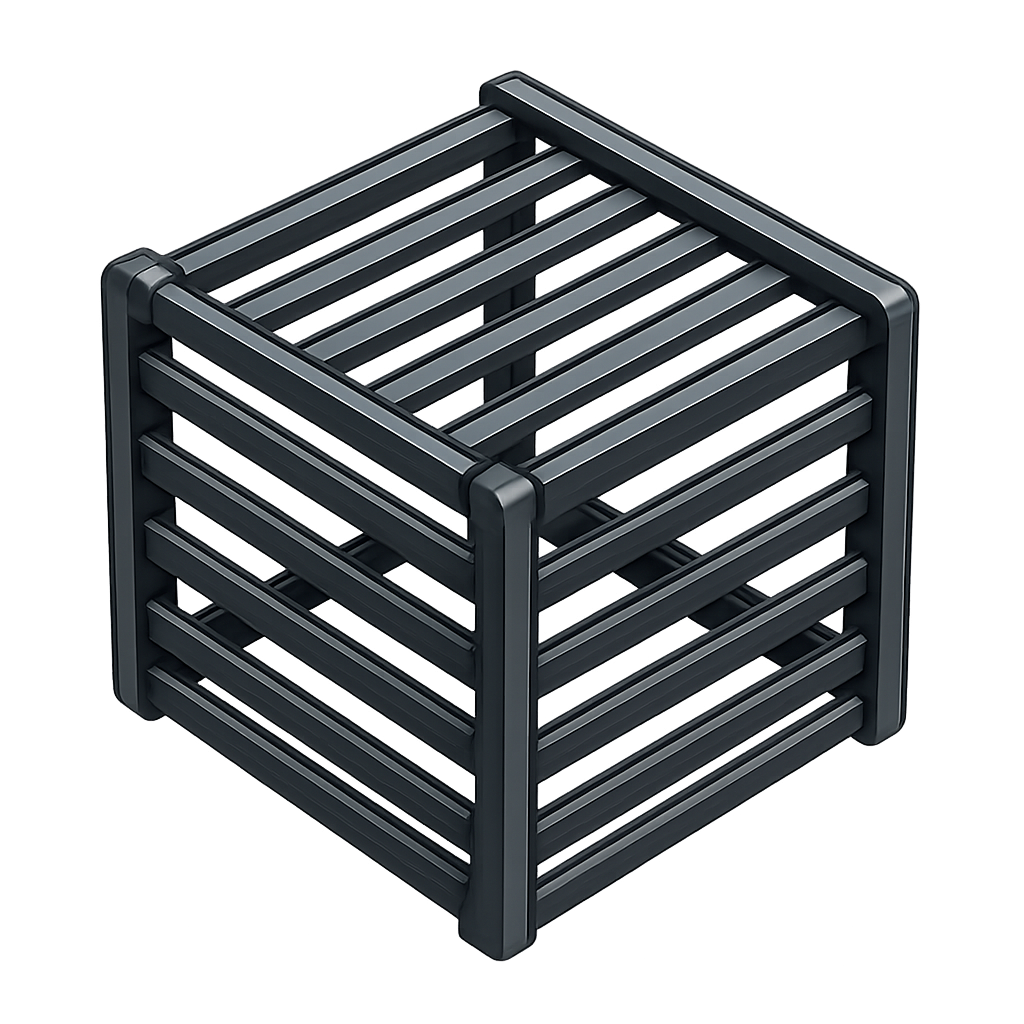 A visually striking 3D icon of a slat armor cage, presented in a three-quarter isometric view. The cage features a sleek design with dark slats and a transparent background, enhancing its volumetric appearance.