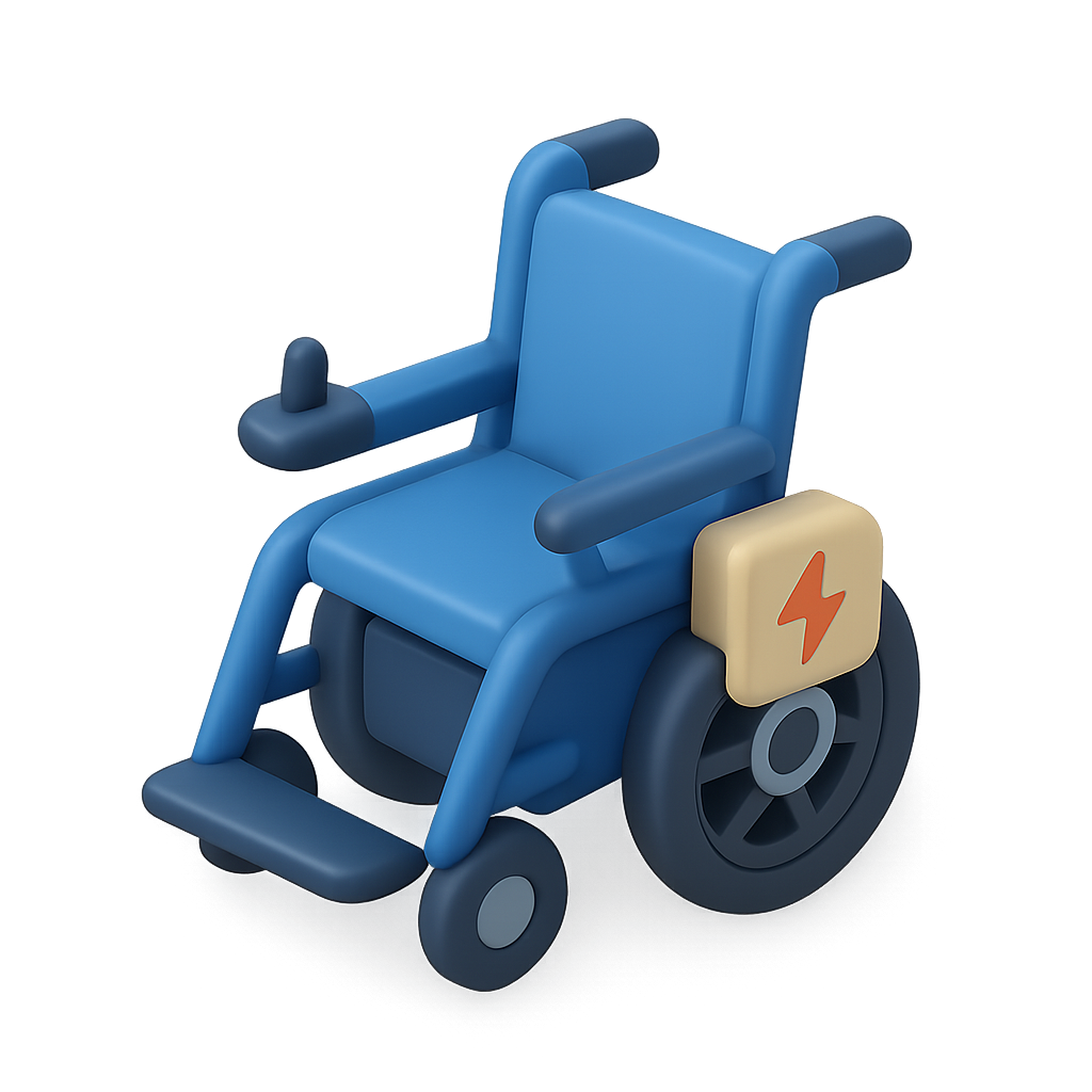 /Collection: /by davooda/Type: PNG/A 3D isometric representation of an electric wheelchair, featuring a blue seat and wheels, designed for a modern and accessible look with a transparent background.