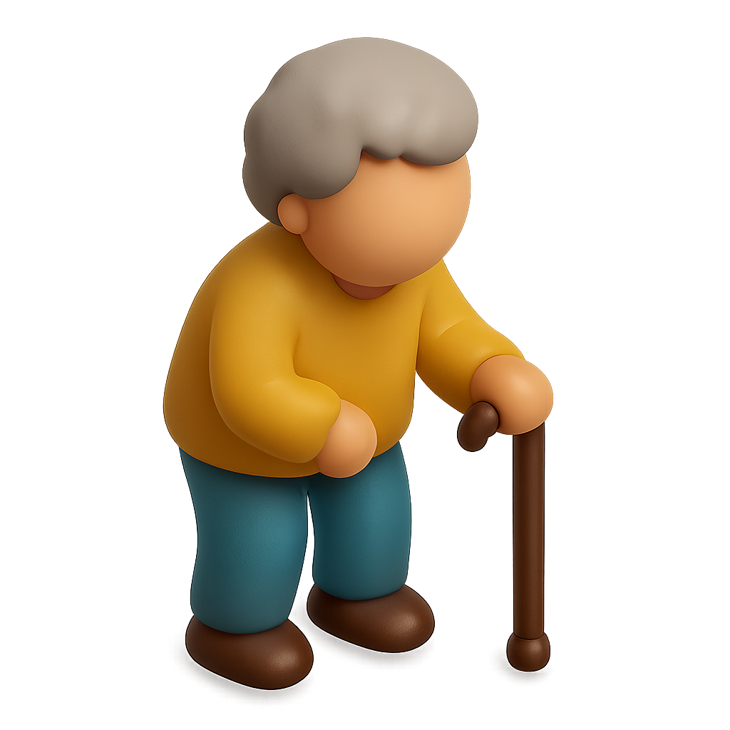 A 3D icon depicting an elderly person using a cane, shown in a three-quarter view. The character features a gray hairstyle, yellow sweater, and blue pants, set against a soft gradient background.