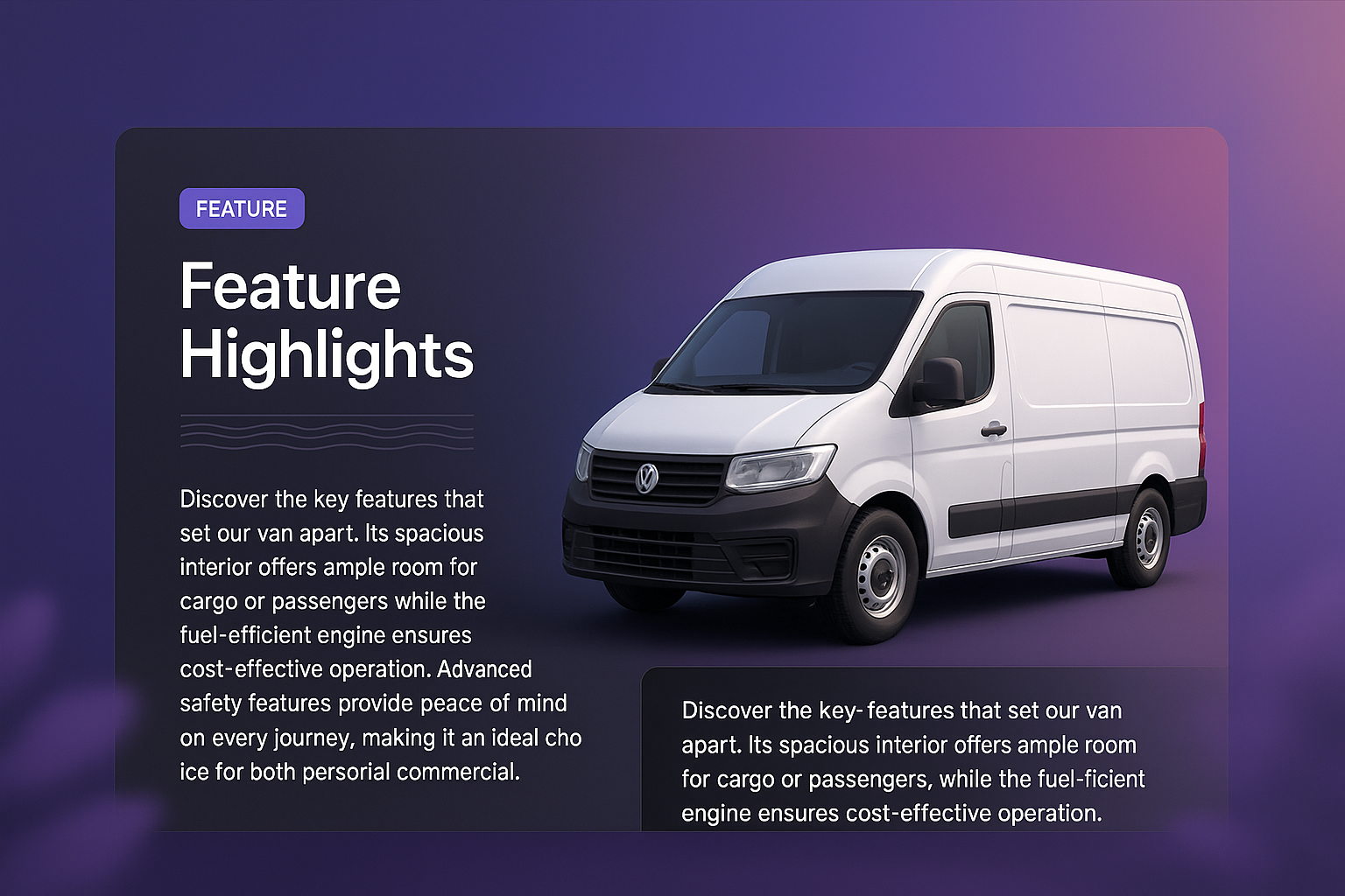 /Collection: /by davooda/Type: PNG/A 3D illustration of a van set against a smooth gradient background. The design includes a dark panel with feature highlights, showcasing the van's spacious interior and efficiency.
