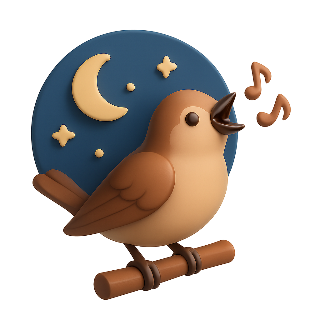A stylized 3D icon of a nightingale singing against a night sky backdrop. The design features a crescent moon, stars, and musical notes, all in a soft, colorful aesthetic.