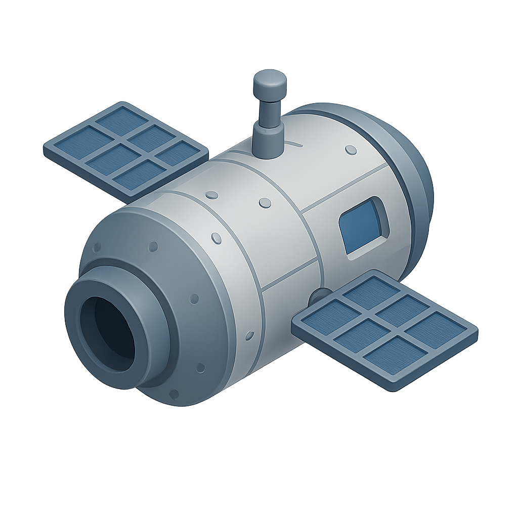 A visually striking 3D icon of a space station module, shown in a three-quarter isometric view. The design features detailed solar panels and a sleek cylindrical body, set against a subtle dark background.