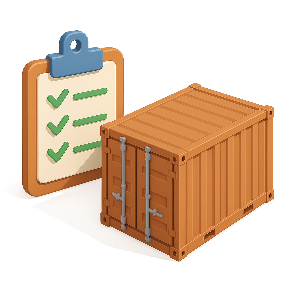 A 3D isometric icon featuring a clipboard with a checklist and a cargo container. The clipboard displays green checkmarks, symbolizing task completion, while the container has a wooden texture.