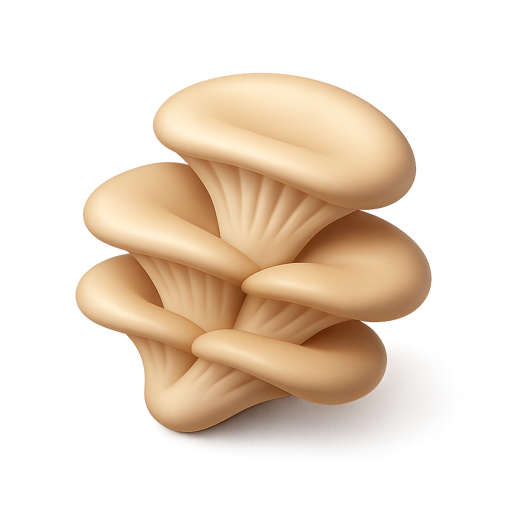 This image features a beautifully rendered 3D icon of oyster mushrooms, stacked in a three-quarter view. The design has a smooth, volumetric feel with a soft background, highlighting the mushrooms' unique shape.