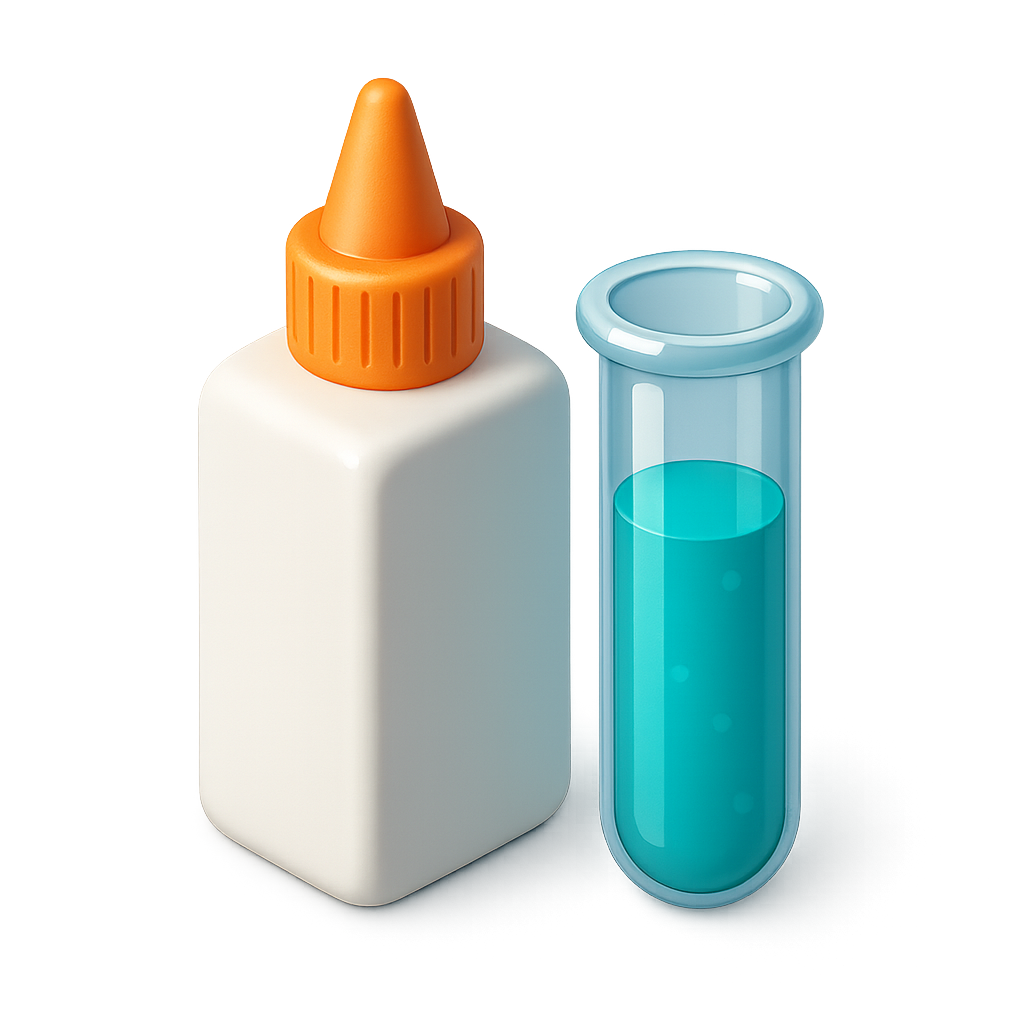 /Collection: /by davooda/Type: PNG/A 3D representation of a glue bottle with an orange cap alongside a transparent test tube filled with blue liquid. The objects are presented in a three-quarter view with a isometric design.