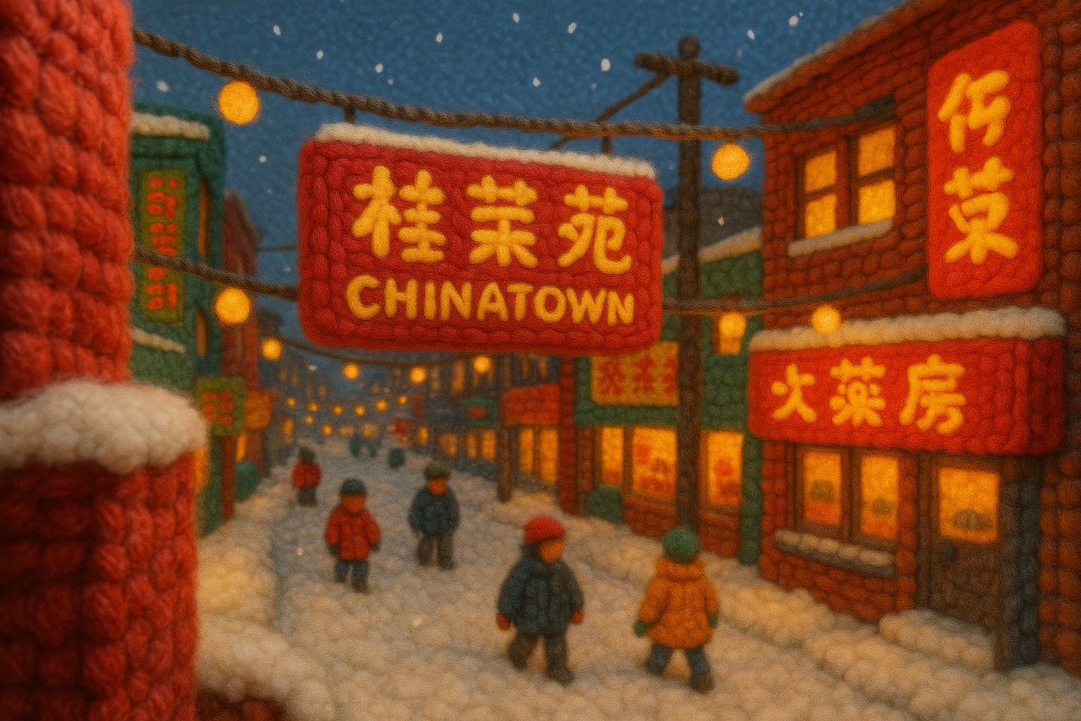 /Collection: /by davooda/Type: PNG/A vibrant 3D depiction of Chinatown in Toronto featuring a layered scene with a cozy holiday vibe. The foreground includes softly blurred elements, while the main and background layers recede into depth, showcasing thick, yarn-like structures. Soft snowfall and tiny figures add to the festive ambiance.