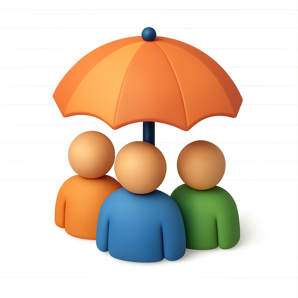 A minimalist 3D representation of three abstract figures gathered under a vibrant orange umbrella. The figures are colored blue, green, and orange, emphasizing a playful, isometric design.
