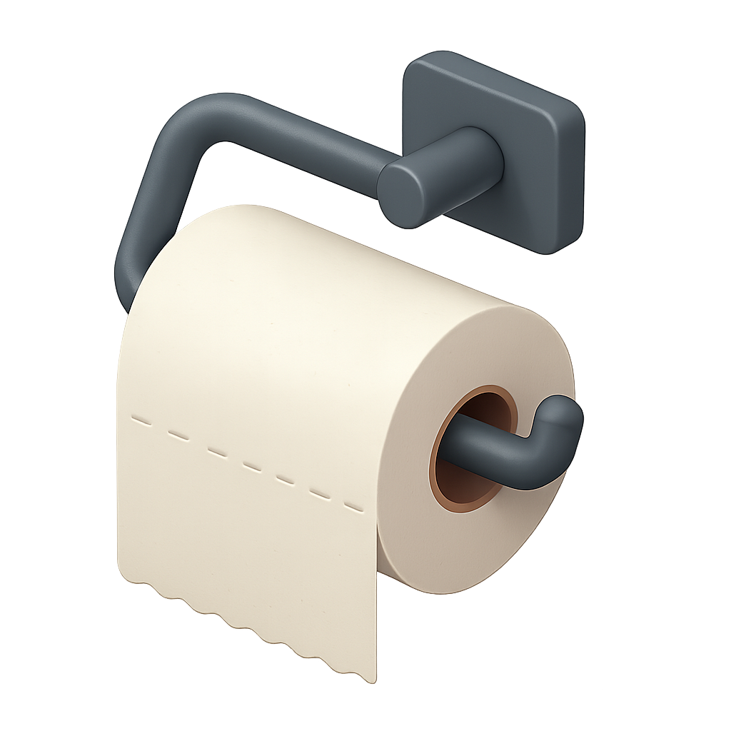 /Collection: /by davooda/Type: PNG/A sleek 3D representation of a toilet paper holder, showcasing a roll of toilet paper mounted on a modern, minimalist bracket. The design features a transparent background and a three-quarter isometric perspective for a volumetric look.
