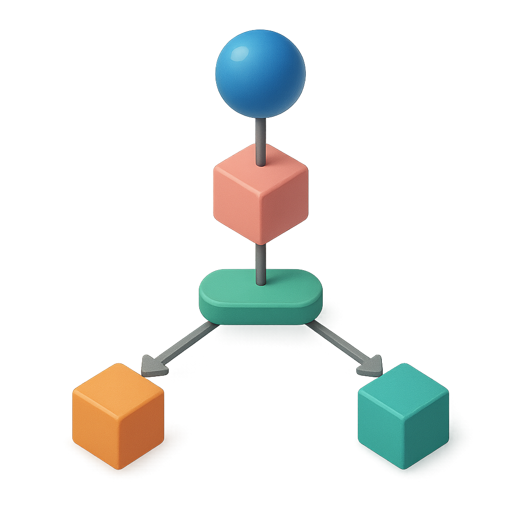 /Collection: /by davooda/Type: PNG/A visually striking 3D flowchart icon featuring a sphere and colored cubes, arranged in a branching layout. The design showcases a three-quarter view with a transparent background, emphasizing its isometric and volumetric qualities.