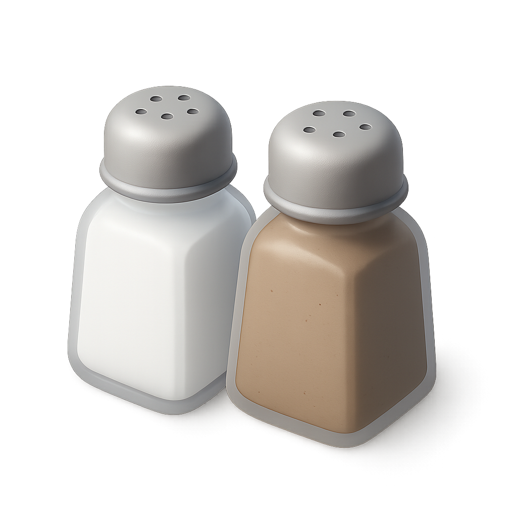 /Collection: /by davooda/Type: PNG/A pair of 3D salt and pepper shakers depicted in a three-quarter view. The shakers feature a glossy metallic top and clear glass body, creating a volumetric effect on a subtle gradient background.
