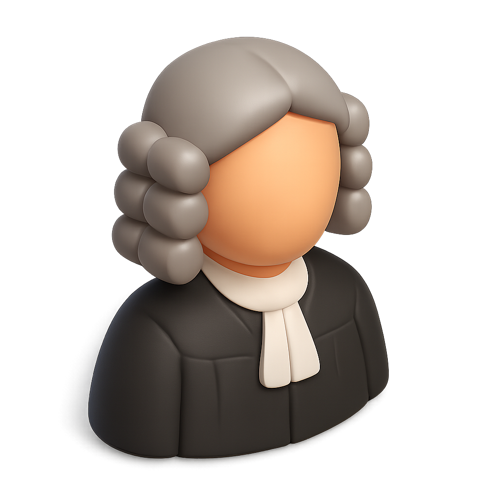 /Collection: /by davooda/Type: PNG/A stylized 3D icon of a judge featuring a smooth, volumetric design. The figure has a grey curly wig, a simple face, and a black robe, set against a gradient background.